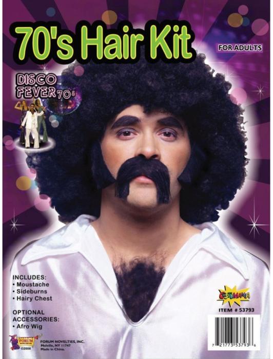 Набор диско 70-х ключает чёрные накладные усы, бакенбарды и волосатую грудь.