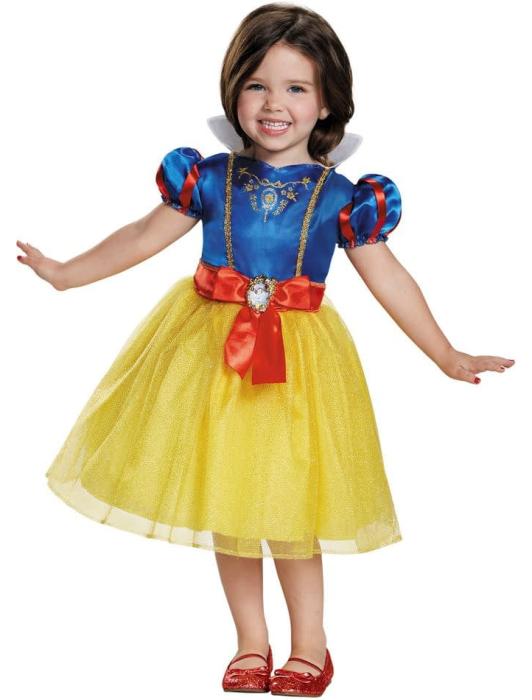Карнавальный костюма Белоснежки. Симпатичное синее платье с красными акцентами, золотистой отделкой и жёлтой юбкой.