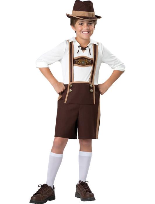 Карнавальный костюм Баварский мальчик включает комбинезон с подтяжками, носки и шляпу.