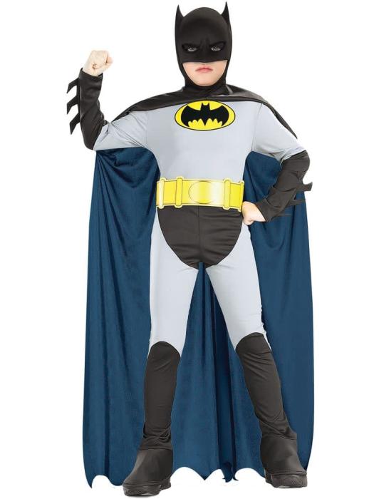 Если Ваш ребенок любит героев мультфильма Бэтмэн, то этот костюм для Вас! Головной убор, комбинезон, пояс и плащ.