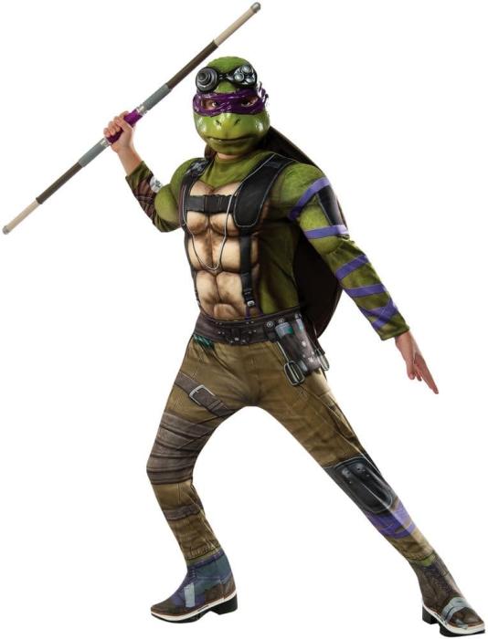Карнавальный костюм Донателло включает комбинезон с бахилами, пояс, панцырь и маску.