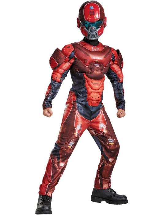 Карнавальный костюм Красный Спартанец Хало детский включает комбинезон и шлем.