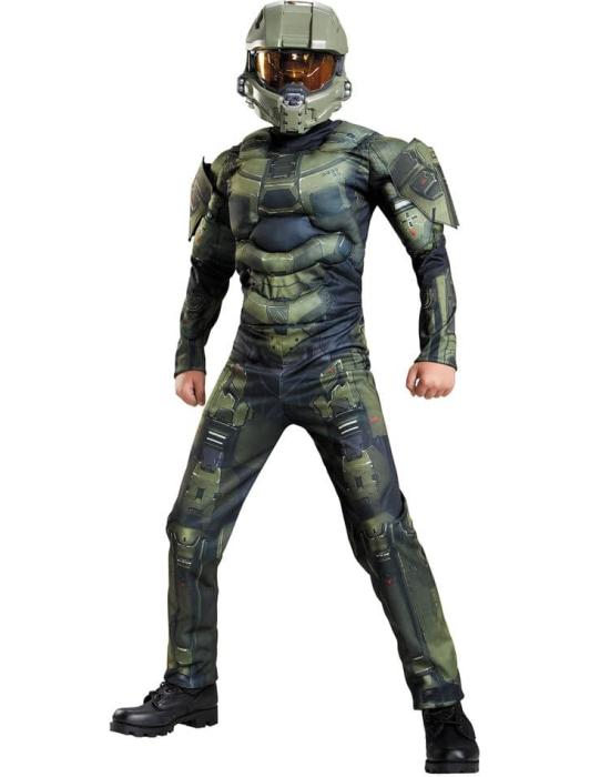 Карнавальный костюм Мастер Чиф включает комбинезон с мускулами и маску.