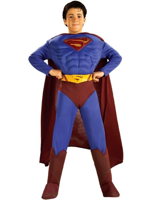 Карнавальный костюм для мальчиков. Синий комбинезон с мускулистой грудью, красный плащ, голенища.