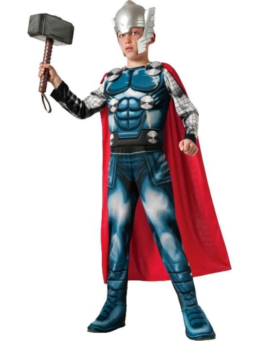В этом костюме ваш ребенок станет настоящим супергероем.Костюм Тора состоит из комбинезона с мышцами,плаща и головного убора.