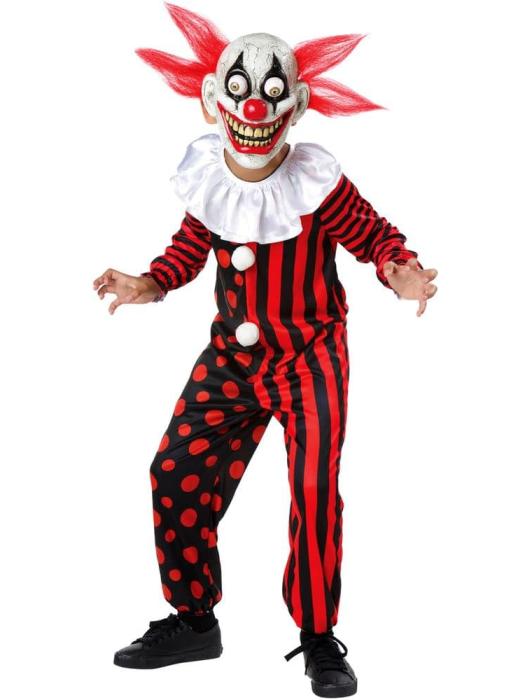 Карнавальный костюм Злой клоун взрослый включает комбинезон, воротник и маску.