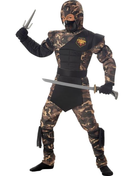 Костюм ниндзя включает кофту с перчатками и капюшоном, брюки, маску и пояс. Туфли, повязки на брюки и оружие не включены.