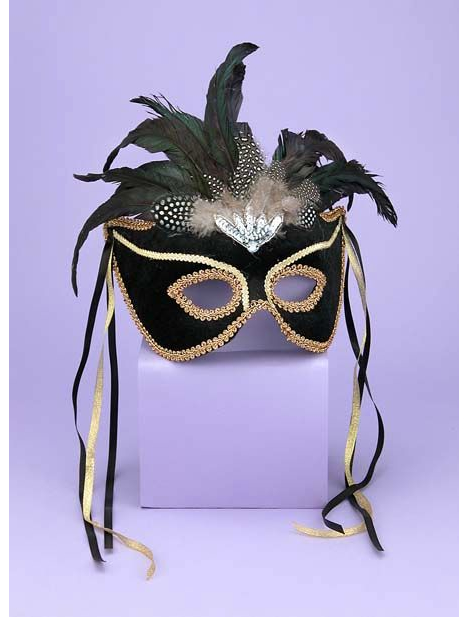 Прекрасная чёрная маска с золотистой отделкой и перьями.