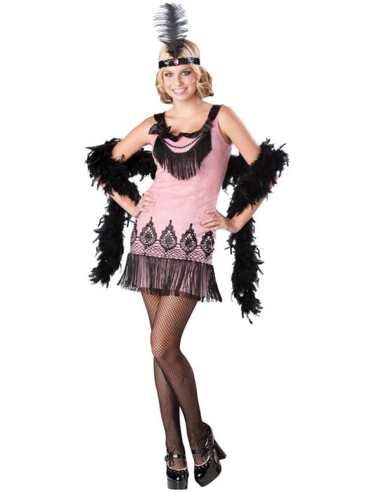 Карнавальный костюм для подростков. Кокетливое платье с бахромой, ожерелье и головной убор. Чулки и боа не включены.