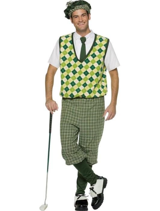 Карнавальный костюм Игрок в гольф включает шляпу, кофту, шорты и бахилы.