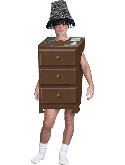 Костюм ночника включает тунику в виде комода с прикреплёнными сверху обертками, деньгами, пачкой сигарет, запиской с номером телефона и шляпу в форме абажура.