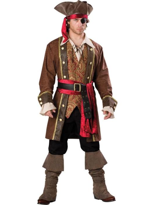 Костюм пирата включает пальто, жилет, ремень, пояс, шляпу и бахилы. Повязка на глаз, серьга, брюки и обувь не включены.