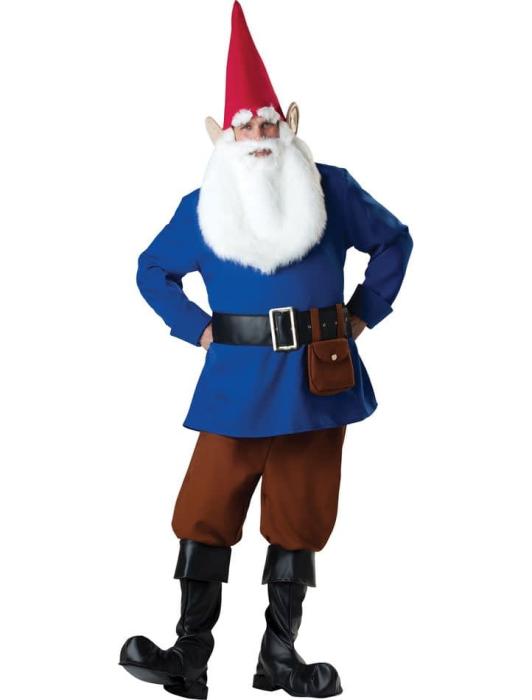 Костюм садового гнома включает тунику, брюки, надувной живот, пояс, шляпу со съёмной бородой и усами, мешок и бахилы. Обувь не включены.