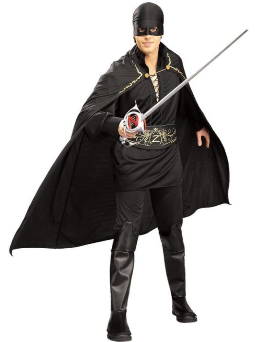 Костюм Зорро включает чёрную рубашку, брюки с прикреплёнными бахилами, плащ, пояс, головной убор с маской. Меч не включен.